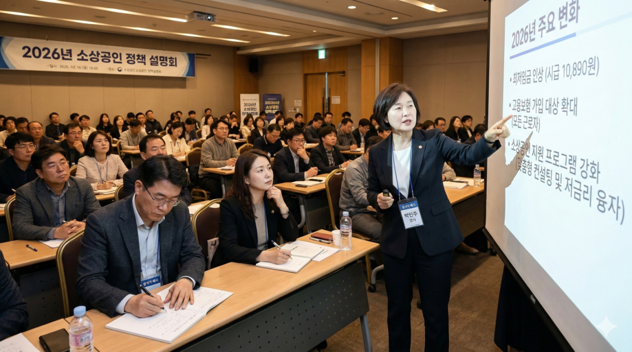 | ▲ 위 사진은 기사 내용과 무관하게 AI(인공지능)가 생성한 이미지입니다. 2026년 정책 변화를 안내하는 소상공인 설명회. (사진 = 챗GPT) |