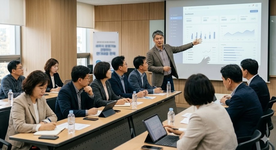 | ▲ 위 사진은 기사 내용과 무관하게 AI(인공지능)가 생성한 이미지입니다. 데이터 분석과 경영 의사결정 교육을 받는 소상공인들. (사진 = 제미나이) |