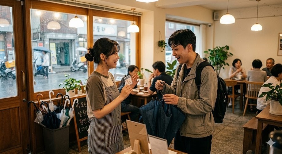 | ▲ 위 사진은 기사 내용과 무관하게 AI(인공지능)가 생성한 이미지입니다. 비 오는 날씨를 활용한 마케팅으로 고객을 모으는 카페의 모습. (사진 = 제미나이) |