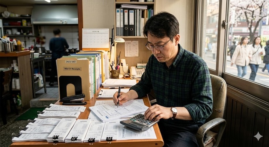 | ▲ 위 사진은 기사 내용과 무관하게 AI(인공지능)가 생성한 이미지입니다. 부가가치세 신고를 준비하는 점주의 모습. 1분기 신고 마감은 4월 25일로, 미리 준비해야 한다. (사진 = 제미나이) |
