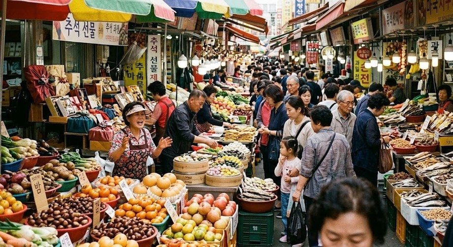 | ▲ 위 사진은 기사 내용과 무관하게 AI(인공지능)가 생성한 이미지입니다. 추석을 앞두고 분주한 전통시장 골목상인들의 모습. (사진 = 제미나이) |