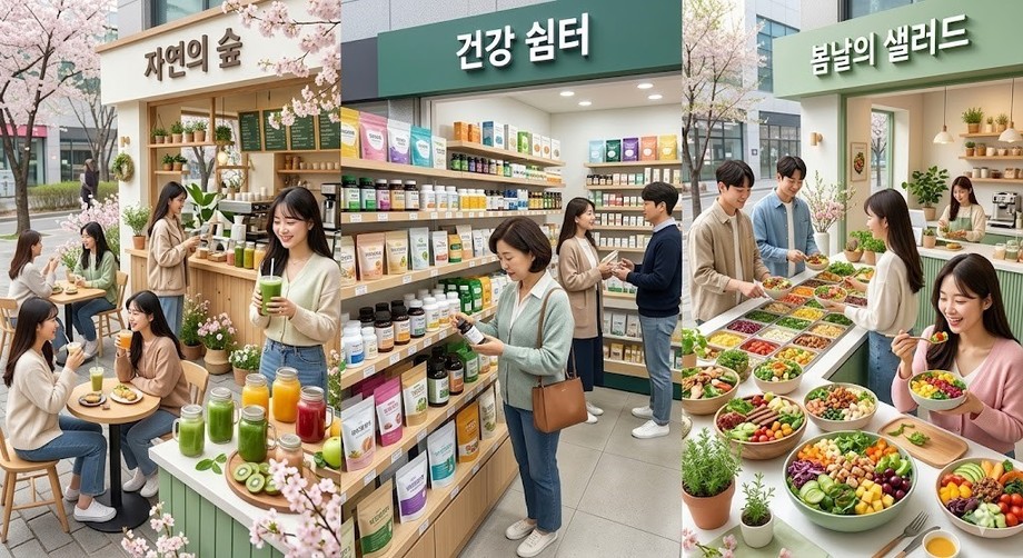 | ▲ 위 사진은 기사 내용과 무관하게 AI(인공지능)가 생성한 이미지입니다. 건강·웰빙 상품을 판매하는 다양한 소상공인들의 매장. 2024년 봄 소비 트렌드는 '건강'에 집중되고 있으며, 이를 활용하는 점주들의 매출이 크게 증가하고 있다. (사진 = 제미나이) |