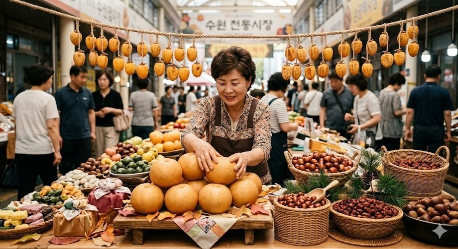 | ▲ 위 사진은 기사 내용과 무관하게 AI(인공지능)가 생성한 이미지입니다. 신선도를 자랑하는 전통시장의 추석 상품 진열. (사진 = 제미나이) |