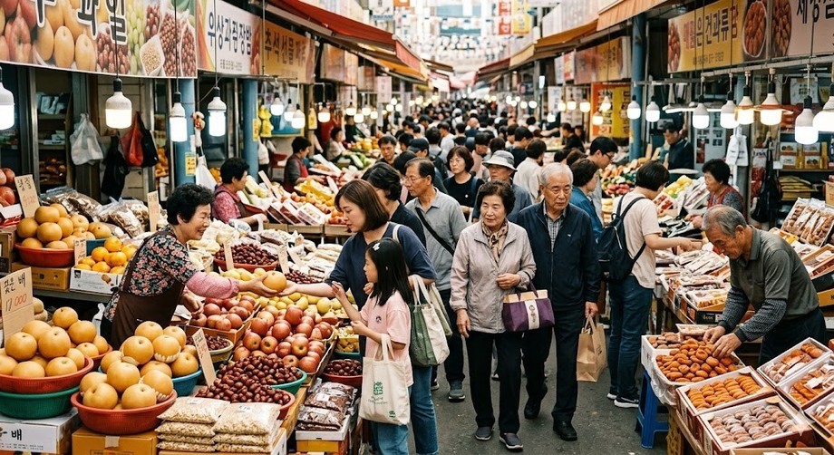 | ▲ 위 사진은 기사 내용과 무관하게 AI(인공지능)가 생성한 이미지입니다. 추석을 앞두고 고객들로 북적이는 전통시장의 풍경. (사진 = 제미나이) |