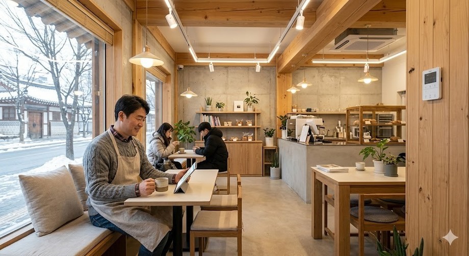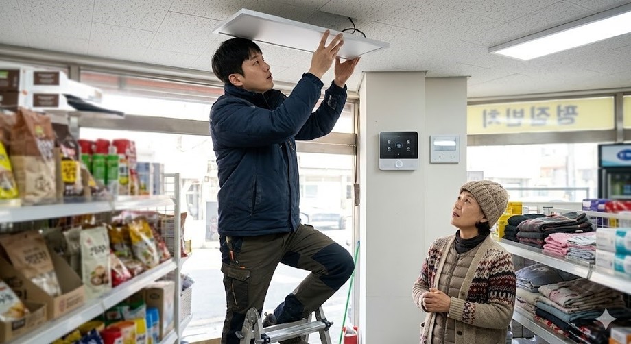| ▲ 위 사진은 기사 내용과 무관하게 AI(인공지능)가 생성한 이미지입니다. LED 조명 교체와 스마트 온도조절기 설치로 동절기 에너지 비용을 절감하는 소상공인. (사진 = 제미나이) |