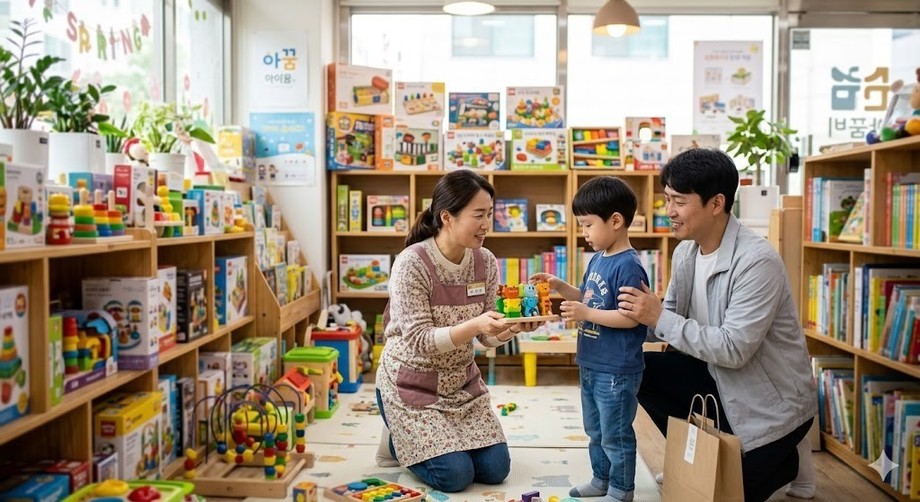 | ▲ 위 사진은 기사 내용과 무관하게 AI(인공지능)가 생성한 이미지입니다. 어린이날을 맞아 아이에게 맞춤형 상품을 추천하는 소상공인의 모습. (사진 = 제미나이) |