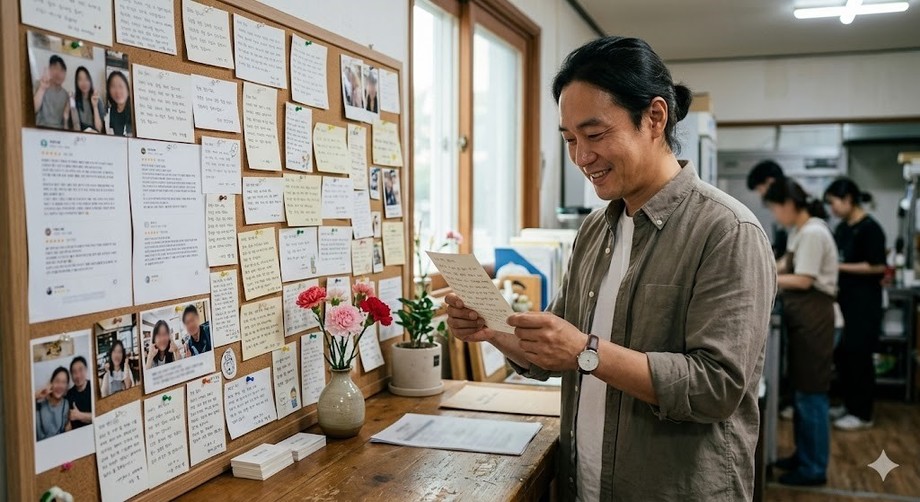 | ▲ 위 사진은 기사 내용과 무관하게 AI(인공지능)가 생성한 이미지입니다. 고객들의 감사 메시지를 소중히 여기는 소상공인의 모습이 진정한 감사 마케팅의 본질을 보여준다. (사진 = 제미나이) |