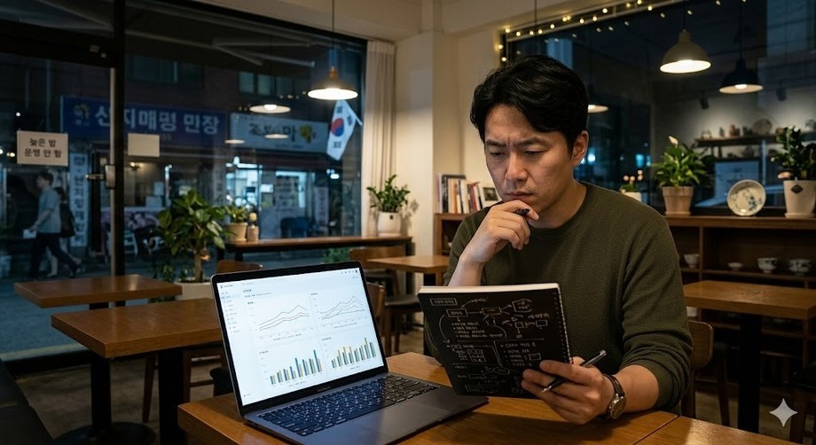 | ▲ 위 사진은 기사 내용과 무관하게 AI(인공지능)가 생성한 이미지입니다. 매출 정체를 돌파하기 위해 전략을 짜는 3년 차 소상공인. (사진 = 제미나이) |