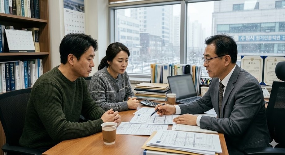 | ▲ 위 사진은 기사 내용과 무관하게 AI(인공지능)가 생성한 이미지입니다. 세무사와 상담하며 절세 방법을 알아보는 소상공인 부부. (사진 = 제미나이) |