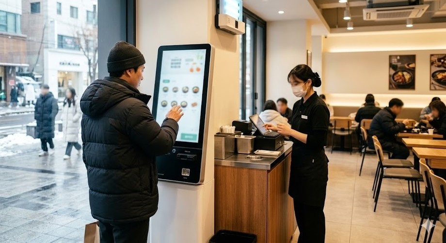 | ▲ 위 사진은 기사 내용과 무관하게 AI(인공지능)가 생성한 이미지입니다. 키오스크와 직원 서비스를 병행하는 음식점 현장 (사진 = 제미나이) |