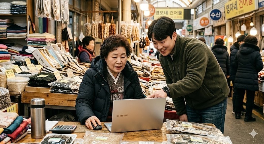 | ▲ 위 사진은 기사 내용과 무관하게 AI(인공지능)가 생성한 이미지입니다. 온라인 스토어 개설에 도전하는 전통시장 소상공인. (사진 = 제미나이) |