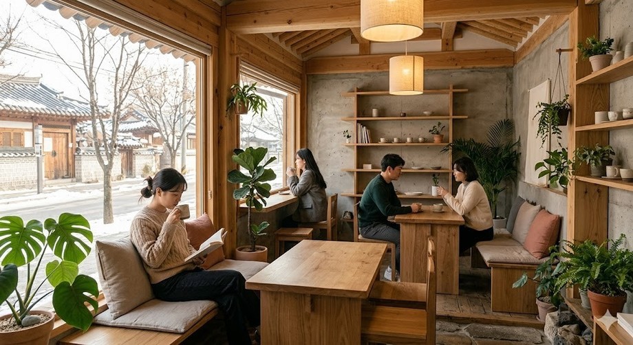 | ▲ 위 사진은 기사 내용과 무관하게 AI(인공지능)가 생성한 이미지입니다. 자연 소재와 미니멀 디자인으로 꾸민 카페가 인기를 끌고 있다. (사진 = 제미나이) |