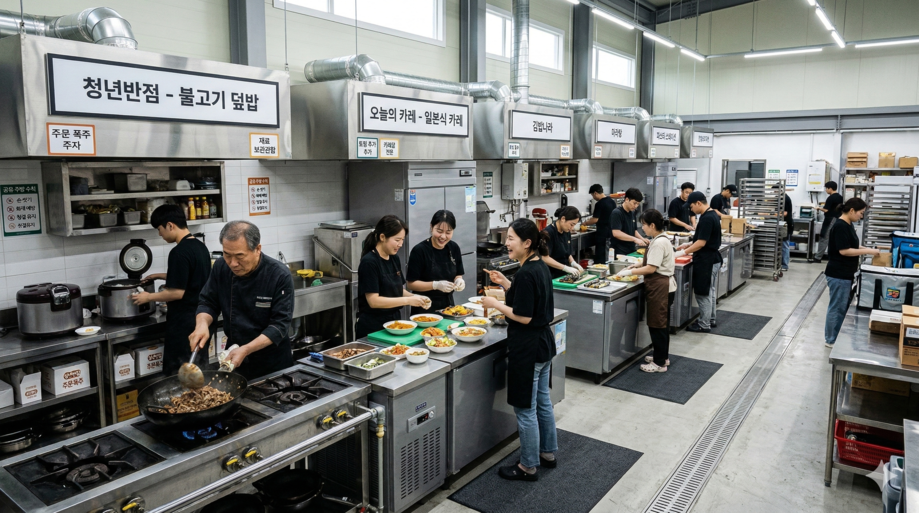 | ▲ 위 사진은 기사 내용과 무관하게 AI(인공지능)가 생성한 이미지입니다. 공유 주방에서 각자의 메뉴를 준비하는 소상공인 셰프들. (사진 = 챗GPT) |