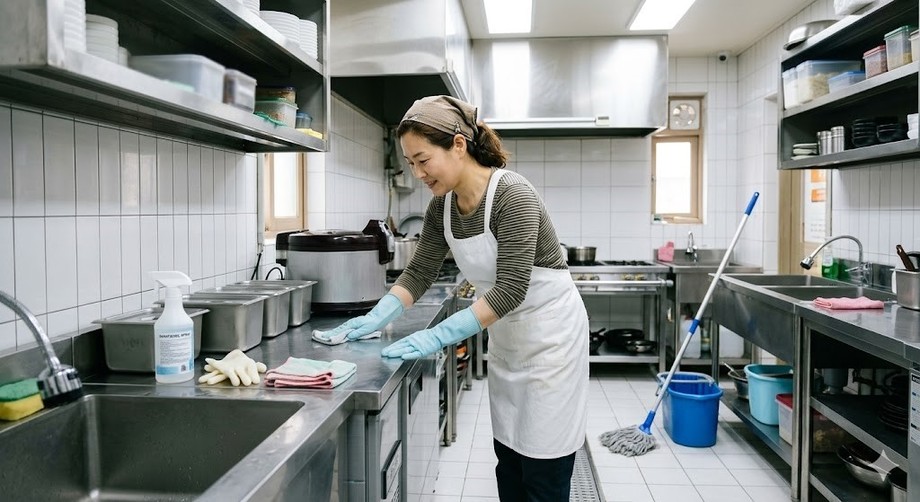 | ▲ 위 사진은 기사 내용과 무관하게 AI(인공지능)가 생성한 이미지입니다. 봄철 위생 점검에 앞서 식품 소상공인의 청소 및 위생관리 장면. (사진 = 제미나이) |