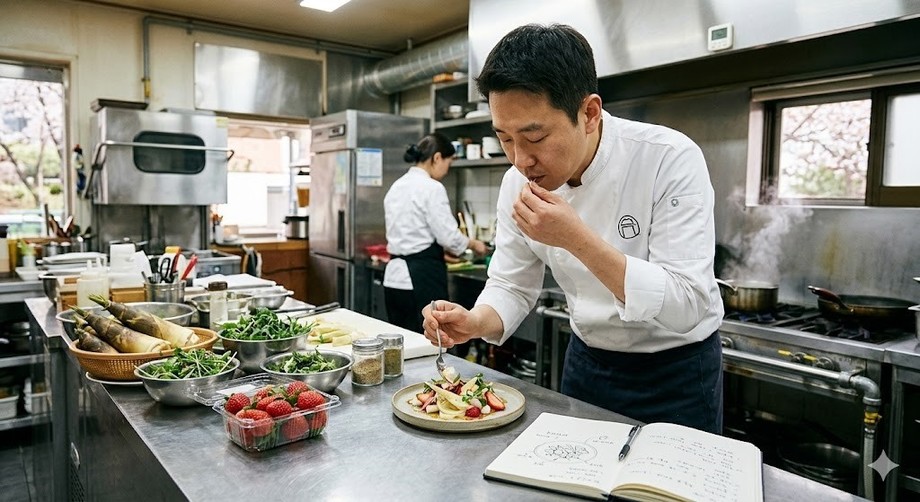 | ▲ 위 사진은 기사 내용과 무관하게 AI(인공지능)가 생성한 이미지입니다. 봄 시즌 한정 메뉴를 개발하는 음식점 쉐프. (사진 = 제미나이) |