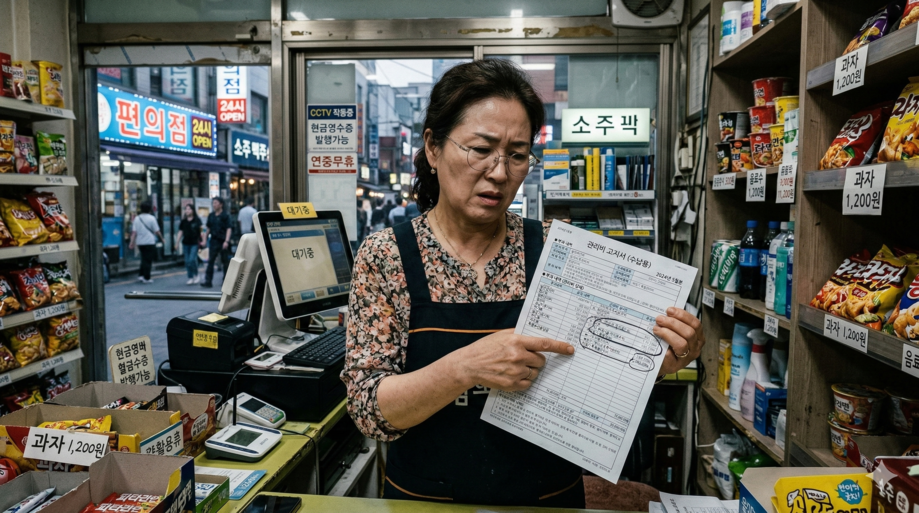 | ▲ 위 사진은 기사 내용과 무관하게 AI(인공지능)가 생성한 이미지입니다.불투명한 관리비 고지서를 들여다보며 당혹해하는 소상공인. (사진 = 챗GPT) |