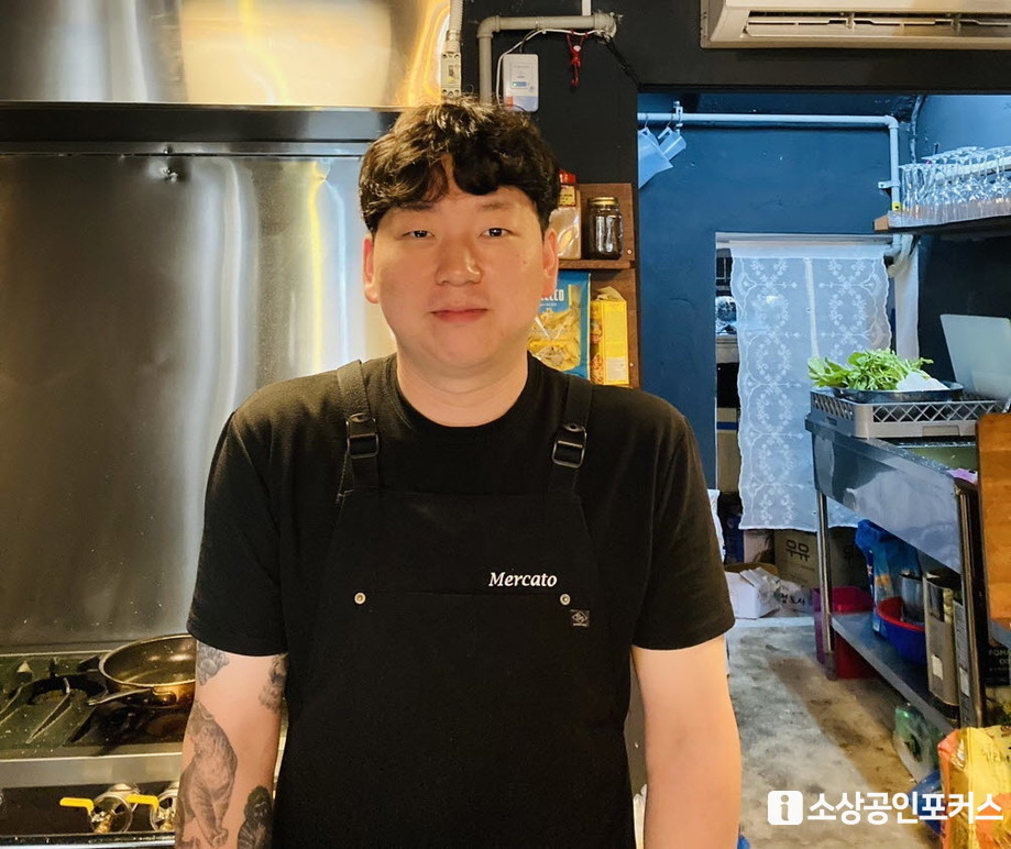 메르카토(Mercato)는 이탈리아어로 '시장'을 뜻한다. 상호부터 장소까지, 가게의 정체성이 '시장'이라는 키워드로 일관되게 연결돼 있다. 주방 경력을 쌓은 청년이 어머니의 삶의 터전인 시장을 새로운 무대로 선택한 것이다.