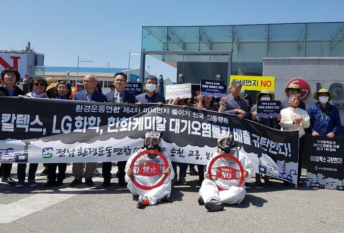 | ▲ 지난 4월 18일 LG화학 화치공장앞에서 여수환경운동연합 등 전남환경운동연합소속 7개 단체가 대기오염물질배출 석유화학업종 중 전국 1위 GS칼텍스와 측정값 조작 LG화학 등에 대해 규탄 기자회견을 갖고 있는 모습.ⓒnewsis |