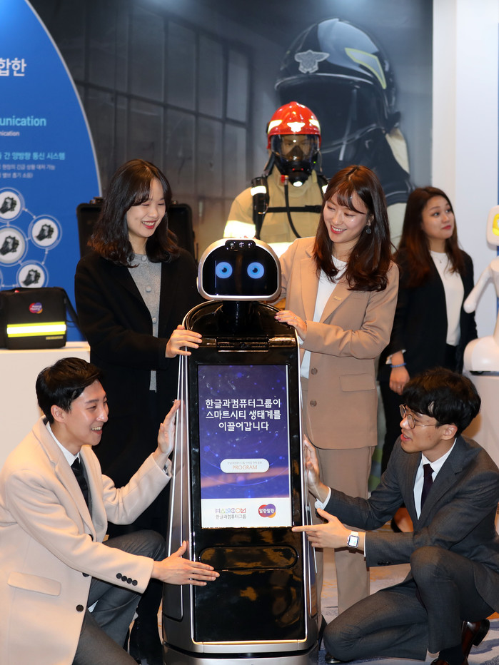 | ▲지난해 12월 6일 한글과컴퓨터그룹 신사업 전략 발표 기자간담회에 앞서 신입직원들이 한컴그룹 인공지능 기반의 안내로봇과을 선보이고 있는 모습.(사진=한글과 컴퓨터 제공) |