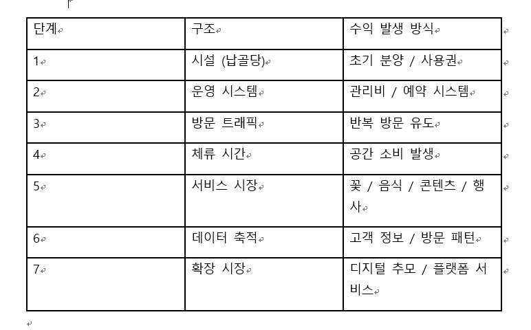추모는 감정에 머무르지 않는다. 데이터가 되고, 서비스가 된다. 영상 제작, 기록 정리, 온라인 추모, 행사 운영, F&B 서비스 등 다양한 시장이 확장된다. 결국 구조는 하나로 정리된다. 시설 → 플랫폼 → 체류 → 감정 → 데이터 → 서비스