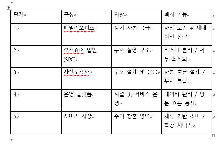 첫째, 자본은 직접 시설을 운영하지 않는다. 둘째, 수익은 시설이 아니라 그 위에서 작동하는 구조에서 발생한다. 페밀리오피스는 대부분 SPC (Special Purpose Company) 형태의 오프쇼어 법인을 통해 투자에 참여하며 자산과 리스크를 분리하고, 세무 효율을 높이며, 글로벌 자본이 자유롭게 유입될 수 있도록 만든다. 이후 자산운용사가 개입한다. 여기서 자산운용사의 역할은 단순한 자금 집행이 아니다. 시설, 운영, 서비스까지 이어지는 전체 구조를 설계하고, 자본이 그 안에서 어떻게 흐를 것인지 결정하는 것이다.
