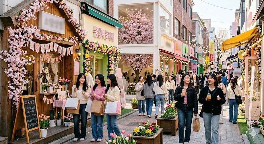 | ▲ 위 사진은 기사 내용과 무관하게 AI(인공지능)가 생성한 이미지입니다. 봄 시즌을 맞아 화려한 장식으로 고객을 맞이하는 상권 곳곳의 소매점들. 봄은 소상공인들의 '황금 시즌'으로 평년 대비 30~50% 매출 증가가 일반적이다. (사진 = 제미나이) |