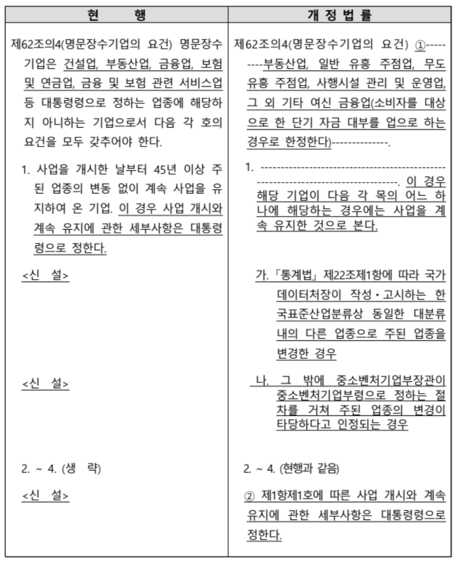 이에 따라 개정안은 일부 유흥·사행성 업종 등 일부를 제외하고, 건설업, 금융업, 보험업 등도 신청이 가능하도록 개선하였다. 이를 통해 다양한 분야에서 모범적인 명문장수기업을 발굴할 수 있을 것으로 기대된다.