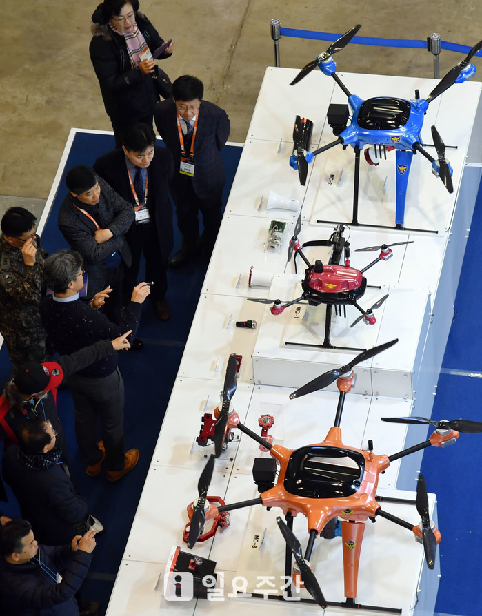 | ▲▲지난 1월 24일 부산 벡스코 제1전시장에서 열린 '2019 드론쇼 코리아'를 찾은 관람객들이 한국항공우주연구원이 개발하고 있는 재난치안용 드론 시스템과 공중 무인 모빌리티 등을 둘러보고 있는 모습. |