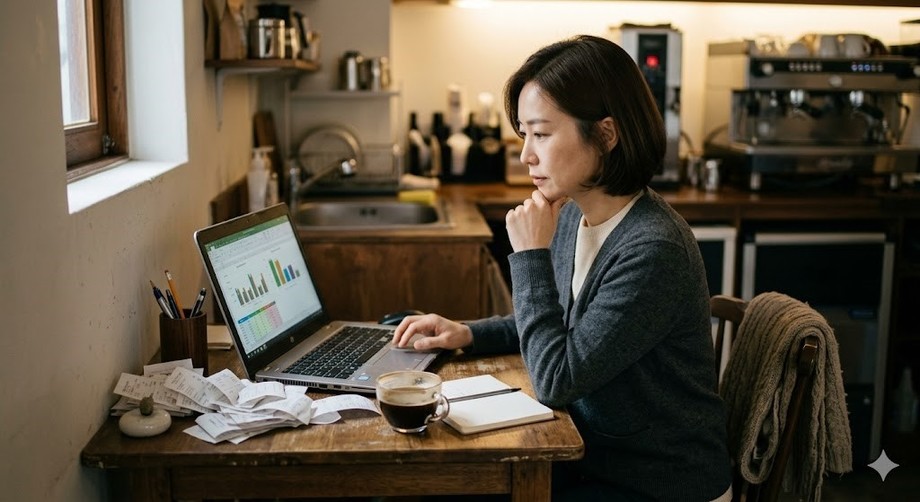| ▲ 위 사진은 기사 내용과 무관하게 AI(인공지능)가 생성한 이미지입니다. 카페 경영의 수익성을 분석 중인 한 점주의 모습. 월세와 원두 구매비, 인건비 등이 예상보다 훨씬 많이 들어 적자가 나는 경우가 많다. (사진 = 제미나이) |