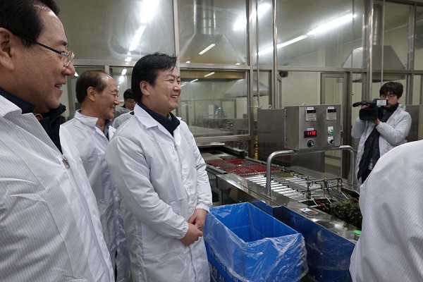 | ▲ 중소벤처기업부 홍종학 장관이 전남 목포에 있는 스마트공장 도입기업인 청해에스앤에프를 방문한 모습. (사진제공=중소벤처기업부) |