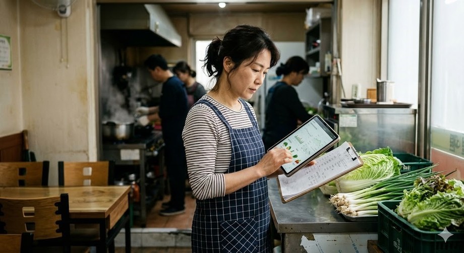 | ▲ 위 사진은 기사 내용과 무관하게 AI(인공지능)가 생성한 이미지입니다. 봄철 식재료 물가를 확인하고 원가 관리를 진행하는 점주의 모습. 계절별 물가 변동에 민첩하게 대응하는 것이 경영의 핵심이다. (사진 = 제미나이) |