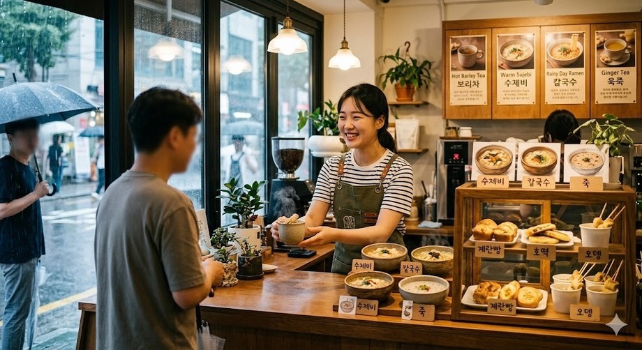 | ▲ 위 사진은 기사 내용과 무관하게 AI(인공지능)가 생성한 이미지입니다. 장마철 특화 메뉴와 서비스로 고객을 모으는 소상공인의 전략. (사진 = 제미나이) |