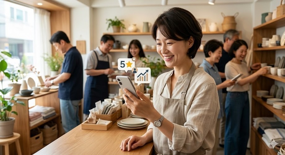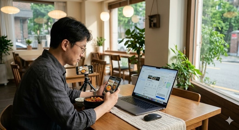 | ▲ 위 사진은 기사 내용과 무관하게 AI(인공지능)가 생성한 이미지입니다. 네이버 플레이스를 최적화하는 소상공인의 모습. (사진 = 제미나이) |