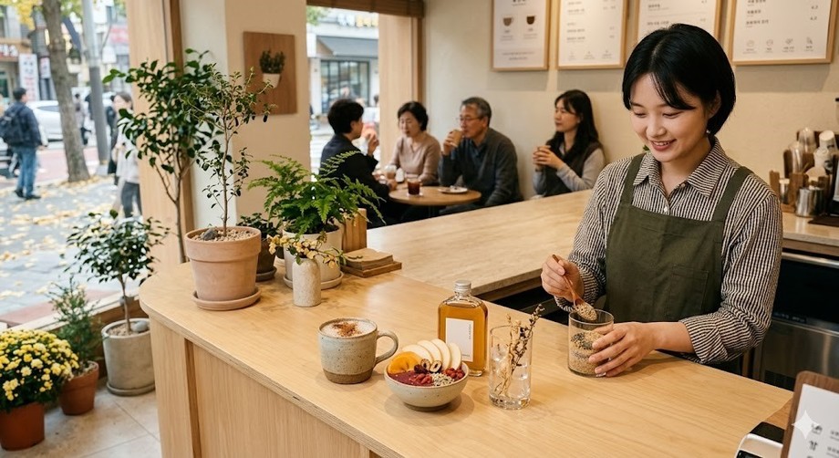 | ▲ 위 사진은 기사 내용과 무관하게 AI(인공지능)가 생성한 이미지입니다. 웰니스 트렌드에 맞춰 건강식을 강조하는 카페. (사진 = 제미나이) |