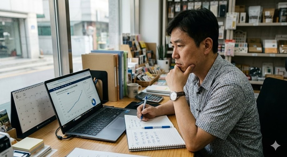 | ▲ 위 사진은 기사 내용과 무관하게 AI(인공지능)가 생성한 이미지입니다. 상반기 소상공인 폐업 통계를 분석하는 사장님의 모습. (사진 = 제미나이) |