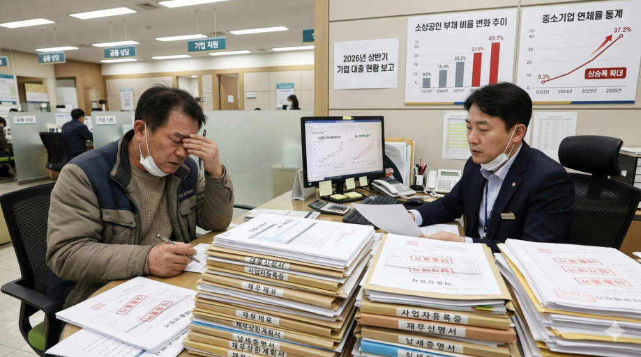 | ▲ 위 사진은 기사 내용과 무관하게 AI(인공지능)가 생성한 이미지입니다. 소상공인 대출 서류가 쌓여 있는 은행 창구의 모습. (사진 = 챗GPT) |