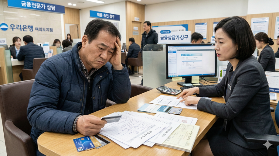 | ▲ 위 사진은 기사 내용과 무관하게 AI(인공지능)가 생성한 이미지입니다. 은행에서 대출 상담을 받는 다중채무 소상공인의 모습. (사진 = 챗GPT) |