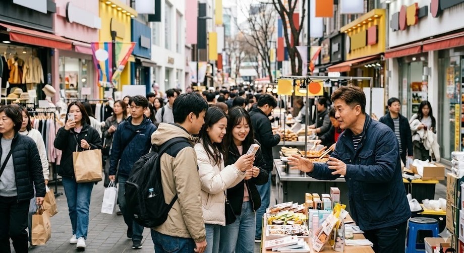 | ▲ 위 사진은 기사 내용과 무관하게 AI(인공지능)가 생성한 이미지입니다. 외국인 관광객들을 맞이하는 소상공인들의 모습. 인바운드 관광 활성화로 외국인 고객은 소상공인들의 새로운 수익원이 되고 있다. (사진 = 제미나이) |
