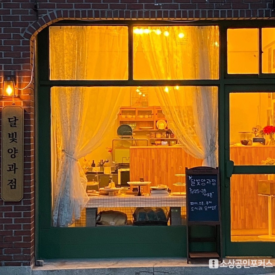 | ▲ 저물어가는 하루, 달빛양과점의 유리창에 따뜻한 불빛이 번진다. 가게 이름처럼 은은하고 부드러운 빛이 골목을 채운다. / 사진=이경희 기자 |
