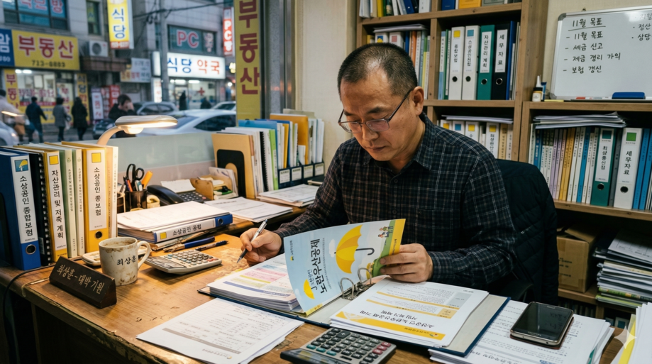 | ▲ 위 사진은 기사 내용과 무관하게 AI(인공지능)가 생성한 이미지입니다. 노란우산공제 가입 서류를 검토하는 자영업자의 모습. (사진 = 챗GPT) |