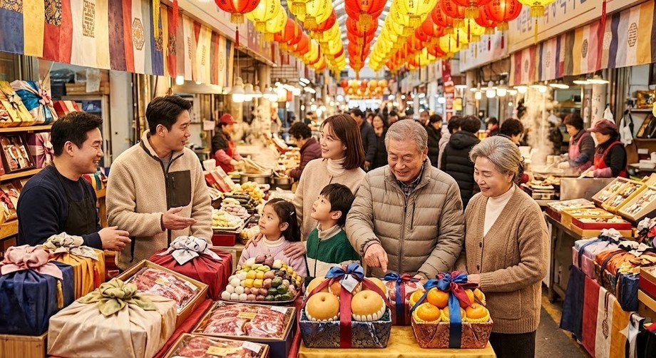 | ▲ 위 사진은 기사 내용과 무관하게 AI(인공지능)가 생성한 이미지입니다. 설 명절을 맞아 온 가족이 함께 선물 구매에 나선 전통시장 풍경. (사진 = 제미나이) |