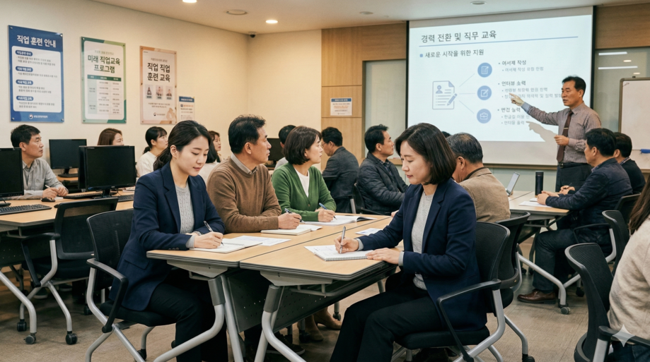 | ▲ 위 사진은 기사 내용과 무관하게 AI(인공지능)가 생성한 이미지입니다. 희망리턴패키지 재취업 교육을 받고 있는 전직 소상공인들. (사진 = 챗GPT) |