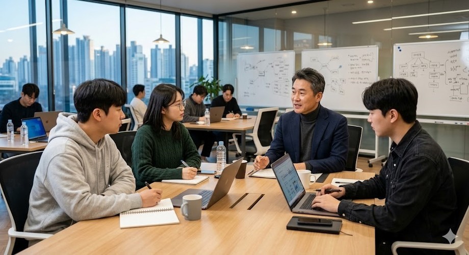 | ▲ 위 사진은 기사 내용과 무관하게 AI(인공지능)가 생성한 이미지입니다. 선배 사업가의 멘토링으로 사업 성공의 길을 닦는 초기 창업자들. (사진 = 제미나이) |