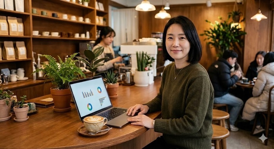 | ▲ 위 사진은 기사 내용과 무관하게 AI(인공지능)가 생성한 이미지입니다. 데이터 분석으로 카페를 성공적으로 운영하는 박은지 사장. (사진 = 제미나이) |