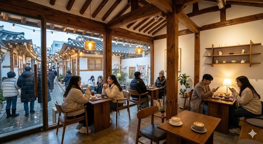 | ▲ 위 사진은 기사 내용과 무관하게 AI(인공지능)가 생성한 이미지입니다. 전통 한옥을 개조한 익선동의 로컬 브랜드 카페가 인기를 끌고 있다. (사진 = 제미나이) |