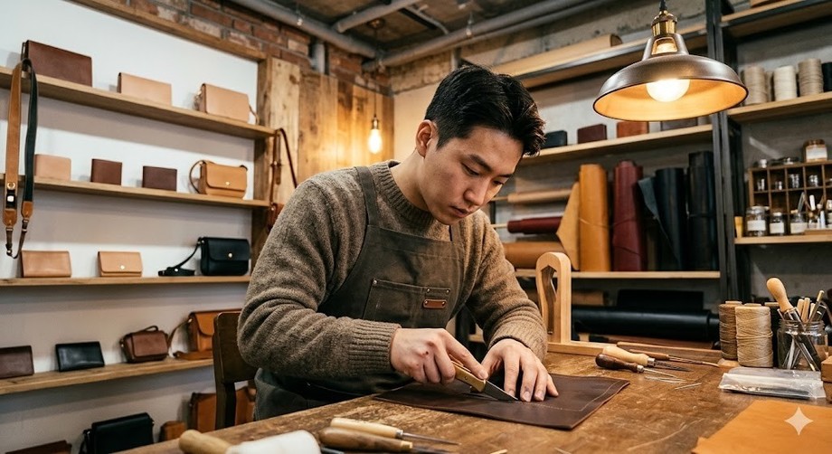 | ▲ 위 사진은 기사 내용과 무관하게 AI(인공지능)가 생성한 이미지입니다. 1인 가죽 공방을 운영하며 연 매출 1억 원을 달성한 청년 사장님. (사진 = 제미나이) |