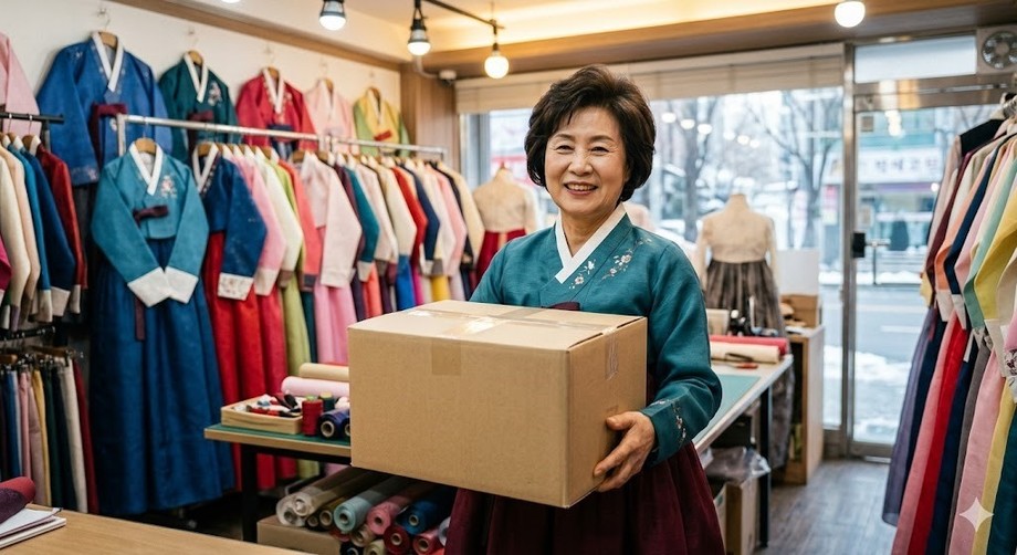 | ▲ 위 사진은 기사 내용과 무관하게 AI(인공지능)가 생성한 이미지입니다. 온라인 주문 덕분에 해외로도 한복을 배송하게 된 김옥자 사장. (사진 = 제미나이) |