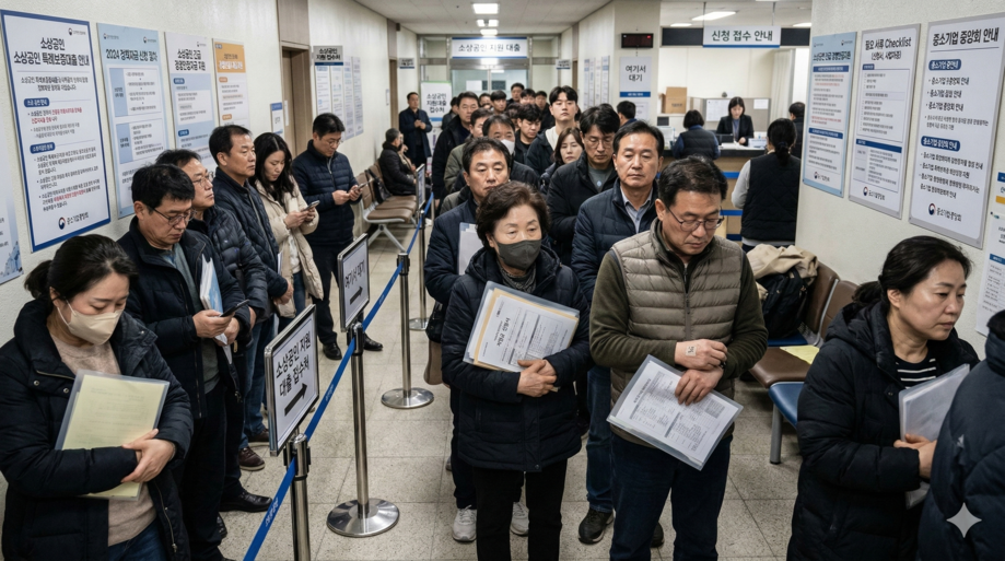 | ▲ 위 사진은 기사 내용과 무관하게 AI(인공지능)가 생성한 이미지입니다.정책자금 신청을 위해 서류를 들고 대기하는 소상공인들. (사진 = 챗GPT) |