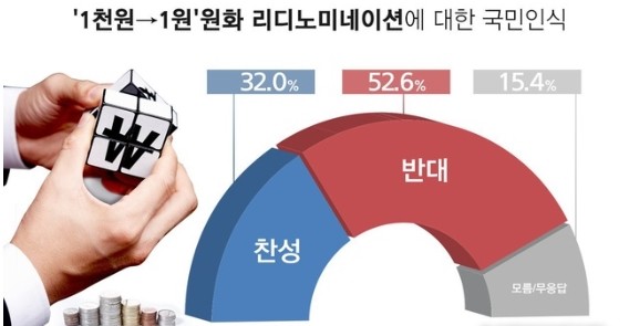 | ▲ 국민 절반 이상이 1000원을 1원으로 조정하는 이른바 원화 리디노미네이션에 반대하는 것으로 조사됐다. (그래픽 = 리얼미터 제공) /출처=뉴시스. |
