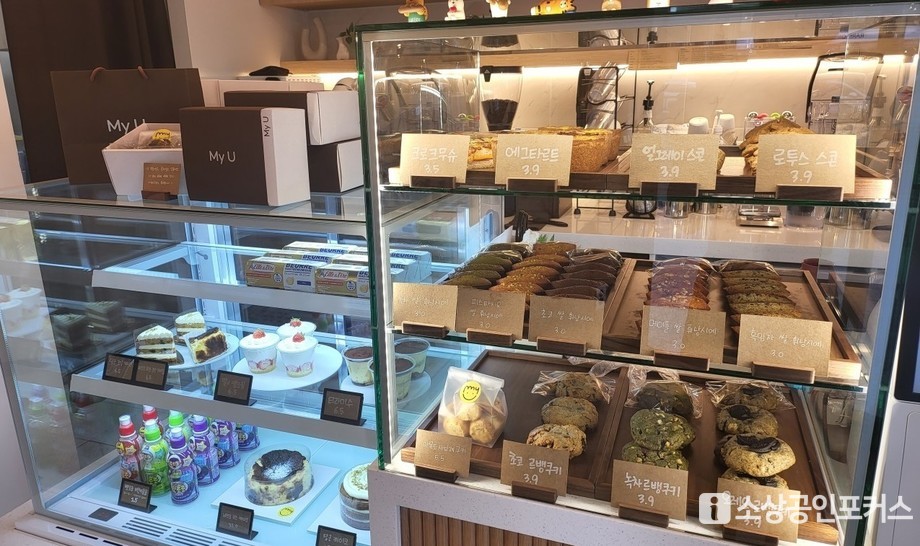 | ▲ 마이유 디저트 쇼케이스. 에그타르트, 까눌레, 바스크 치즈케이크 등 수제 디저트가 진열되어 있다. (사진 = 이경희 기자 / 소상공인포커스 DB) |